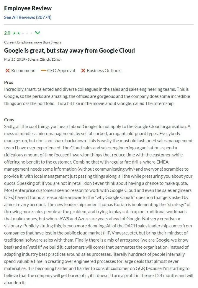 独立成为公司的谷歌云,近两年营收倒是增长不错,在内外部却也颇有怨言:其由上至下的管理模式被认为和谷歌脱节,想要转回总部的员工不在少数;外部的用户在谷歌云上找不到 AWS、Azure 那种客户服务优先的感觉;