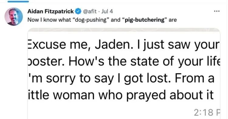 作者|张珺玥 邮箱|zhangjunyue@pingwest.com来源|硅星人(guixingren123)“Jason, you are really out of line. I’mFiona. Amy told me everything!” 周日早上10点,硅谷某科技公司的软件工程师Frank Newton(化名)在WhatsApp上收到了这样一条短信。他觉得肯定是谁误发了信息,于是礼貌回复了对方告诉她发错了号码。随即对方发来信息说非常抱歉,又解释道自己刚发现被男朋友欺骗,还被对方屏蔽了电话,这个男朋友的新号码是朋友发给她的。语气诚恳,又楚楚可怜。面对着这个陌生的心碎女孩,Frank出于善意安慰了几句,没想到对方却把他当成了树洞聊了起来。在女孩的主动攻势下,接下来的几天,两人聊感情聊工作,从诗词歌赋谈到人生哲学,成为了似乎无话不谈的线上好友。一直到半个月后,Fiona聊起她最近正在做一项投资赚了20万美元,并邀请Frank也一起参与时,Frank才猛然意识到,自己可能是遇到了最近广为流传的“杀猪盘(Pig-butchering)”。进入2022年以来,“杀猪盘”在海外愈发猖獗,开始面向没听说过这种诈骗套路的外国人,这种无意错发的短信仅仅只是最近流行起来新玩法之一。很多人都被各种骗局套路玩得晕头转向,不知不觉之间就被骗走了大量的钱。而让人意外的是,就连高科技人才聚集的硅谷也成为了这一波“杀猪盘”受骗的重灾区。