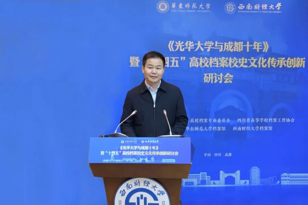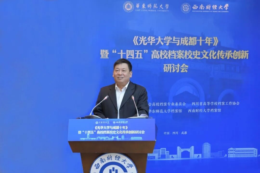 赵德武致辞,对与会领导嘉宾表示热烈欢迎,向《光华大学与成都十年》一书的出版发行致以诚挚祝贺。赵德武指出,高校档案作为大学文化的溯源与载体,忠实记录着一所高校的变迁与发展,凝聚积淀着一所高校的办学思想与精神力量,是学校珍贵的精神财富,也是学校不断发展的动力源泉,在人才培养和文化传承创新中发挥着独特的重要作用。光华大学自创始之日起便与教育强国民族复兴之路紧密相融,其光荣的革命传统和优良的爱国传统,为上海和成都两座城市都留下了恒久的精神财富。希望与会专家深入研讨弘扬大学优秀历史文化,继续推进档案校史共享交流与合作,为大学文化传承创新提供强劲的历史基础、史料基础和档案基础,为建设教育强国、办好人民满意教育做出新的更大贡献。