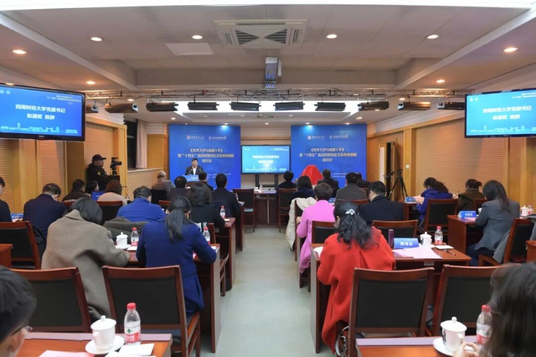近日,西南财经大学和华东师范大学共同为两校合编的《光华大学与成都十年》在我校柳林校区举行新书发布会,并进行交流座谈。华东师范大学党委书记梅兵,党委常委、副校长孙真荣,党委常委、组织部长程静,四川省档案馆副馆长周书生;学校党委书记赵德武,党委副书记曾道荣,党委常委、副校长史代敏,沪蓉两地档案(校史)专家、师生代表参加会议。曾道荣主持会议。