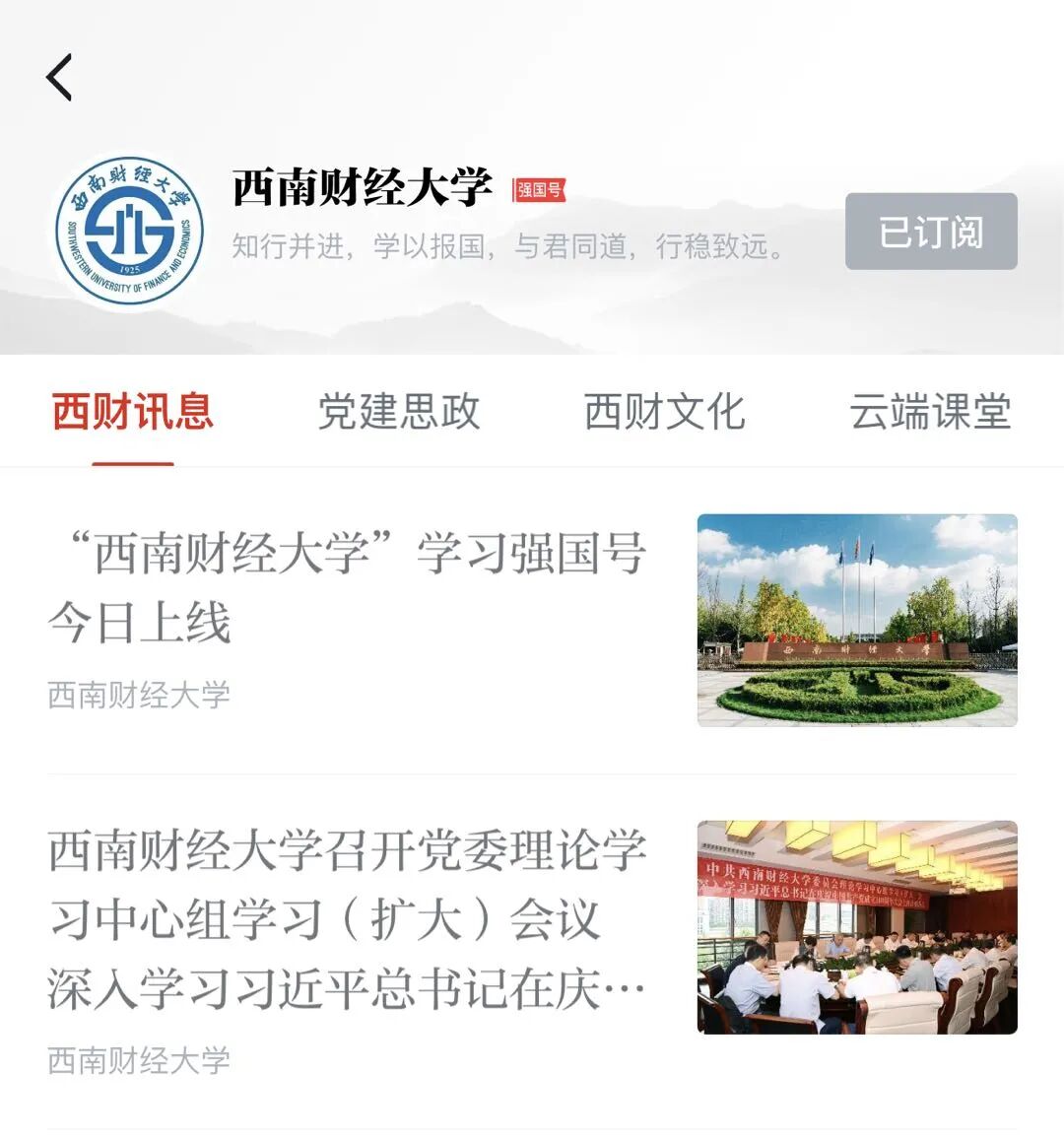 知行并进,学以报国,与君同道,行稳致远。西南财经大学学习强国号期待您的订阅、分享和点赞!