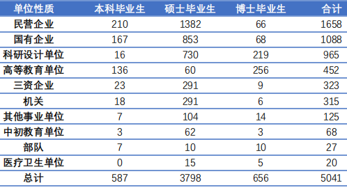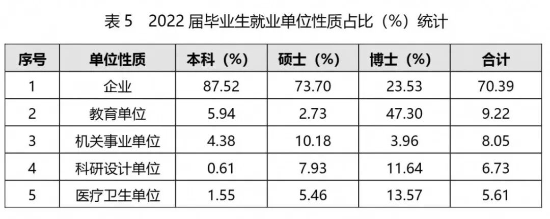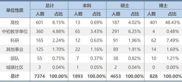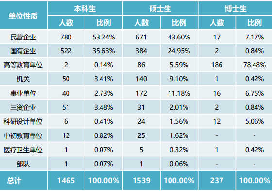 其中本科生在民营(私营)企业就业比例最高,占比50.00%;硕士生在国有企业就业比例最高,占比45.05%;博士生在教育科研等事业单位就业比例最高,占比60.48%。