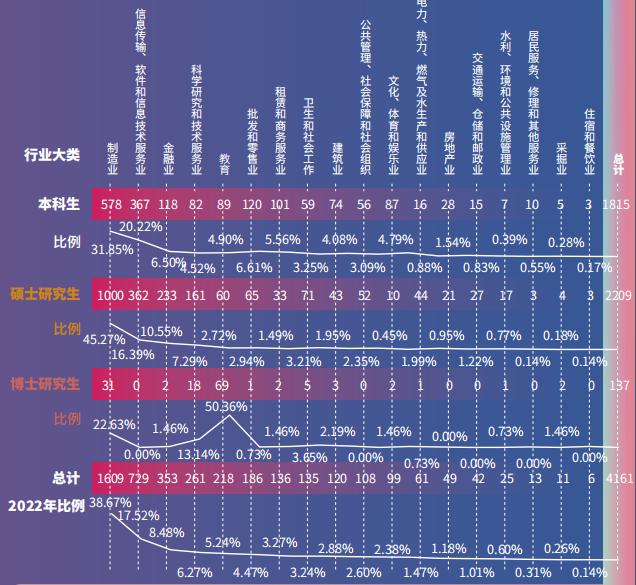 在就业行业中,2022年毕业生中进入制造业、信息传输、金融业、科学研究与技术服务业、教育五类行业比例较高,合计达76.18%。其中,31.85% 的本科生、45.27% 的硕士毕业生进入制造行业。