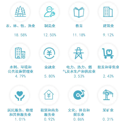 毕业生就业分布在 20 个行业,服务农、林、牧、渔业,水利、环境和公共设施管理业,公 共管理、社会保障和社会组织等涉农行业,助力“三农”和“乡村振兴战略”发展的毕业生比例达到 75.61%。