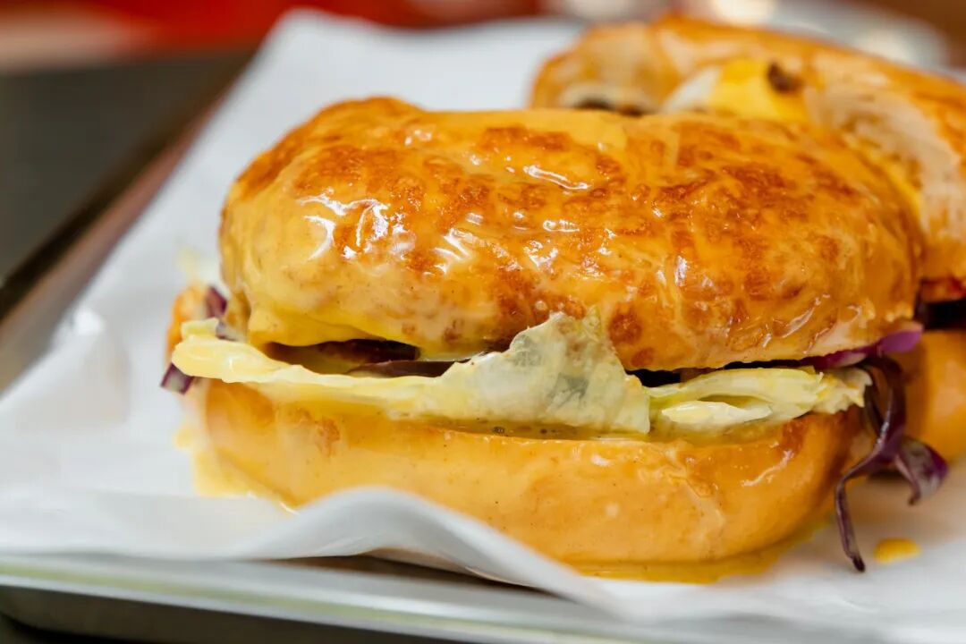正所谓“贝果夹万物”,从中切开加入牛肉、培根、滑蛋,秒变贝果汉堡!