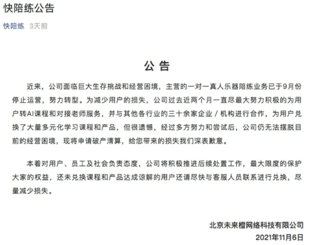 2021 年 11 月,在线陪练头部公司「快陪练」宣布因面临巨大生存挑战和经营困境,申请破产清算。