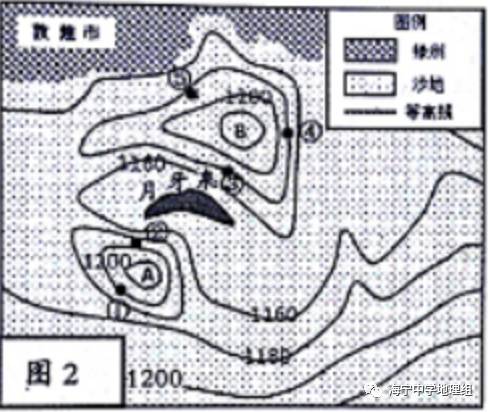 答案: A沙丘。A沙丘南坡沙粒的粗沙和中沙比重较大,而北坡细沙比重较大(或答“A沙丘由南到北沙粒的粒径由粗到细”),(说明月牙泉南侧盛行偏南风),(在偏南风的作用下),说明A沙丘向北移动明显,对月牙泉的威胁较大;而B沙丘南坡和西北坡的粗沙比东坡大,细沙比重比东坡地,(说明月牙泉北侧盛行偏西风),说明B沙任丘向东移动,对月牙泉的戚胁较小。