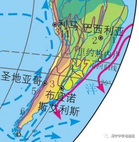 第2题,30°-50°S的安第斯山脉东坡,为西风带背风坡,降水少,形成热带荒漠带。