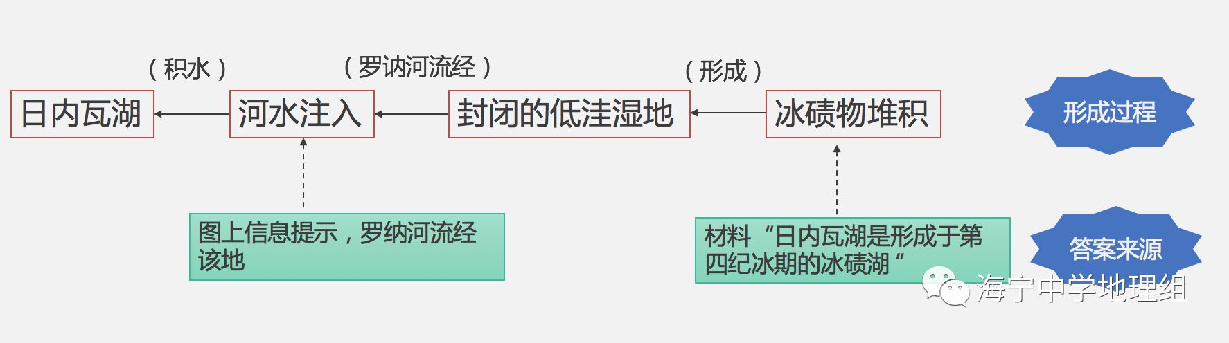 答案:第四纪冰川时期,大量的冰碛物在日内瓦湖附近堆积,形成相对封闭的低洼地,罗讷河流经此处积水成湖