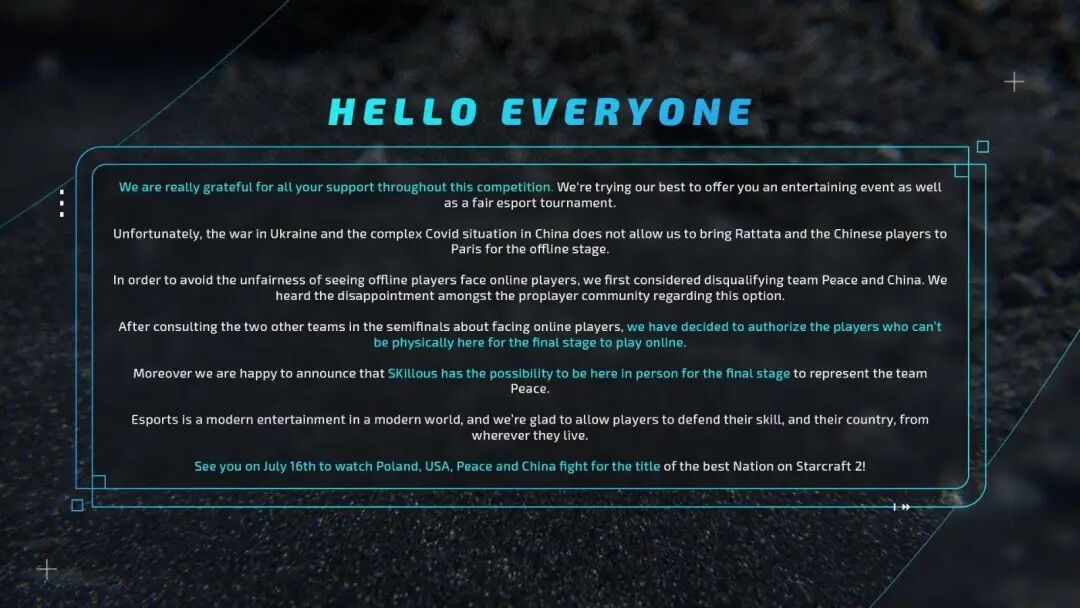 为了避免线下和线上选手对战时的不公平因素,我们一开始决定取消和平队(俄罗斯队)和中国队的参赛资格,但在此期间我们听到了来自玩家社区的反对意见。