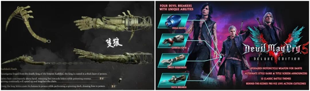 类似本作“机械臂”的设计,其实在《只狼》和《鬼泣5》中都有过相当不错的呈现