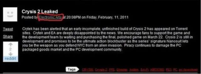 《孤岛危机2》在发售前一个月被破解泄露,EA发文称“游戏仍旧按部就班发售”,但彼时的玩家在游戏发售前就已经通关了,最终导致游戏销量暴死
