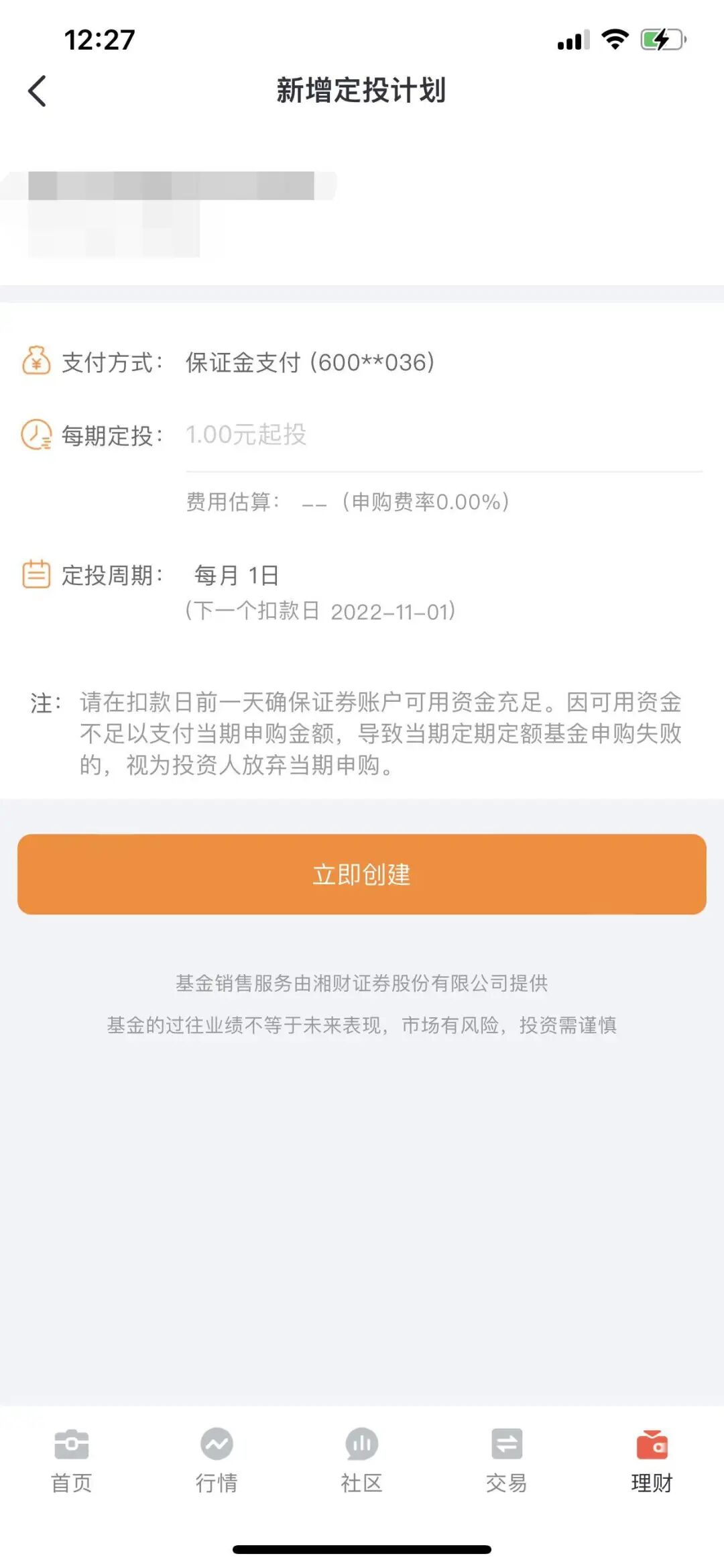 按要求签署相关协议后,进入“新增定投计划”界面,填写金额、周期,完成创建。