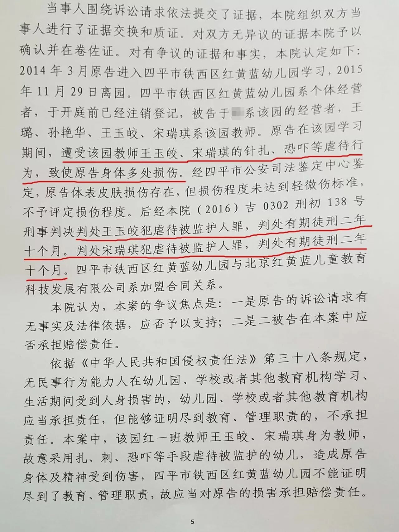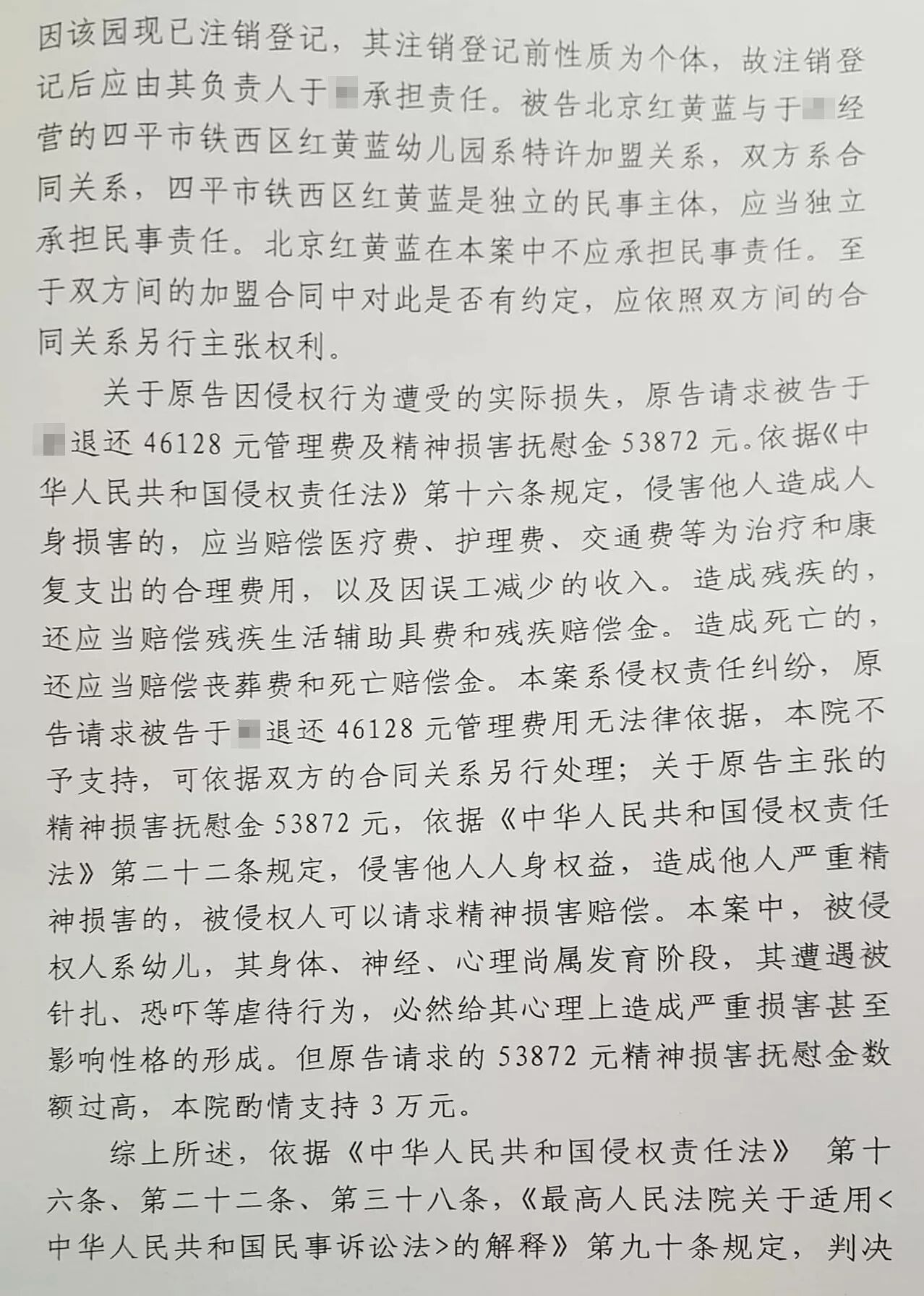 而对于红黄蓝的加盟店来说,由于特许人与加盟人之间互为独立法律主体,实践中认定责任存在一定分歧,也就是因为独立的法律主体,在四平民事阶段,法院并未认定北京红黄蓝对于加盟人的侵权行为承担责任。