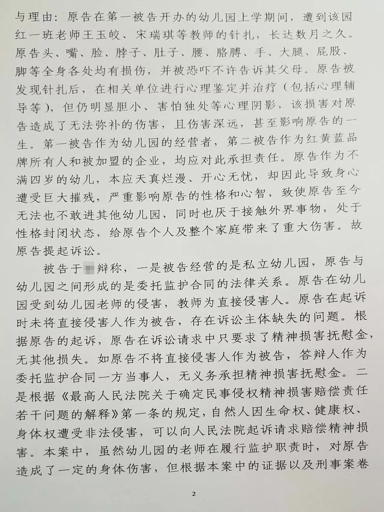 今天早些时候收到了红黄蓝案一审的民事判决,红黄蓝的加盟商赔偿每个受害人精神损害抚慰金3万元,北京红黄蓝公司无责。