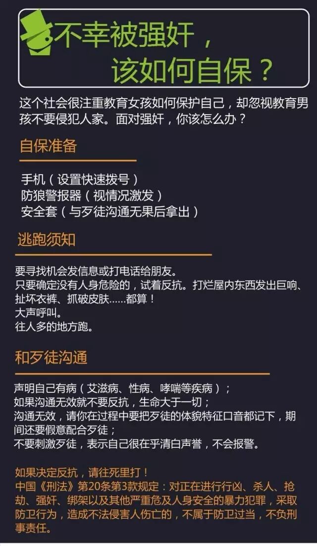 数据显示,84%-90%的强奸发生在认识的人之间,包括:丈夫/男友、父母、亲戚、朋友、同学、老师、老板、同事等等。71%的强奸是有预谋的,60%的强奸犯是已婚或有固定性伴侣……面对强奸,女生要怎么做呢?