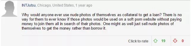 "为什么有人会同意以裸照作抵押贷款?他们根本不知道自己的裸照会被用在什么地方,比如色情网站,别人不花钱就能看到。与其抵押裸照获得贷款,还不如直接卖自己的裸照赚钱。。。"