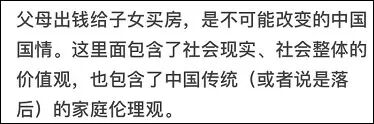 最后,是家庭伦理观。儿子买一套房子,看上去是给儿子买的,其实父母、包括以后的孩子都会使用居住,所以,买一套房子也是父母期盼的。