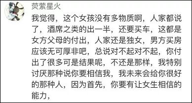 有的人站男方,觉得这姑娘太过现实,话里话外透露着攀比和埋怨。