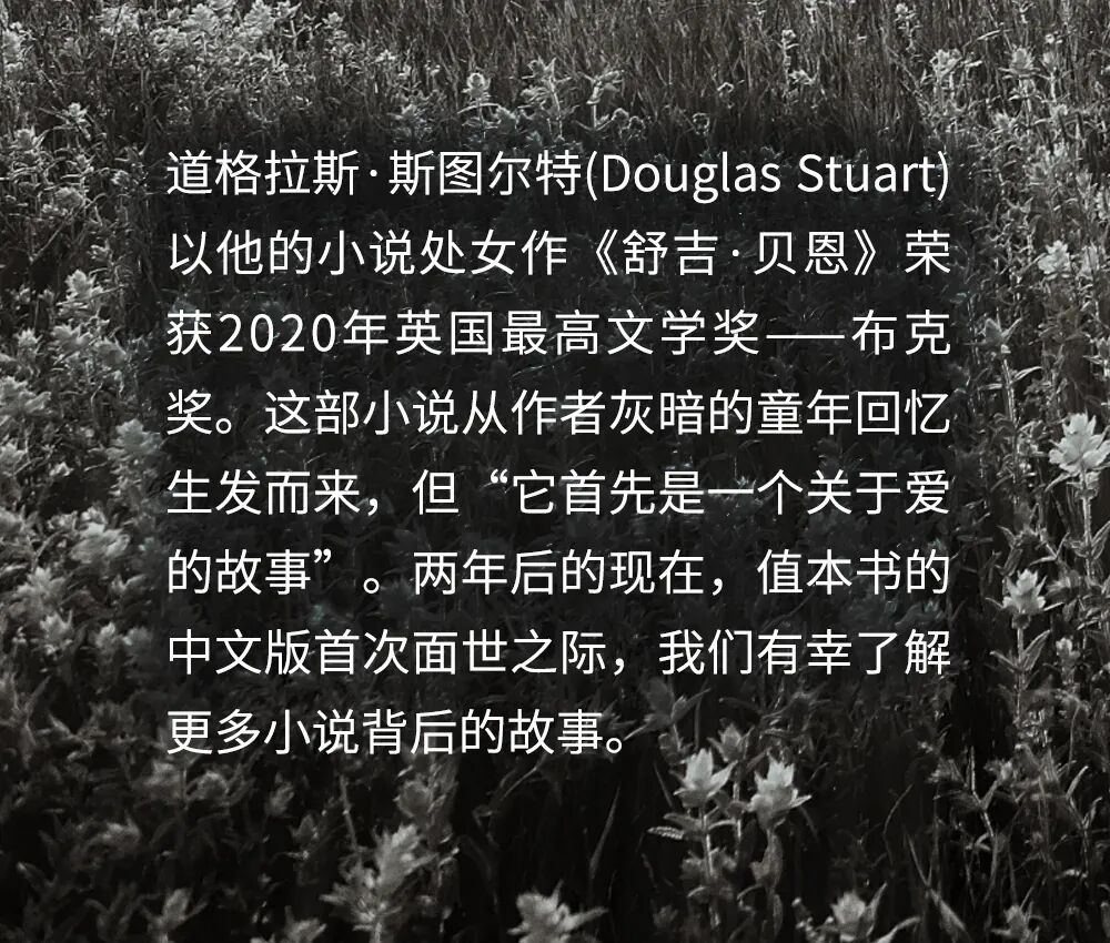 Douglas Stuart:对我来说,它一定是一个爱的故事,虽然它触及了很多主题,有些黑暗的方面,但它首先是一个关于爱的故事。它描绘了孩子对父母的爱,它没有任何附加条件,几经检验都不会让人失望,就是这样坚韧、顽强的爱。