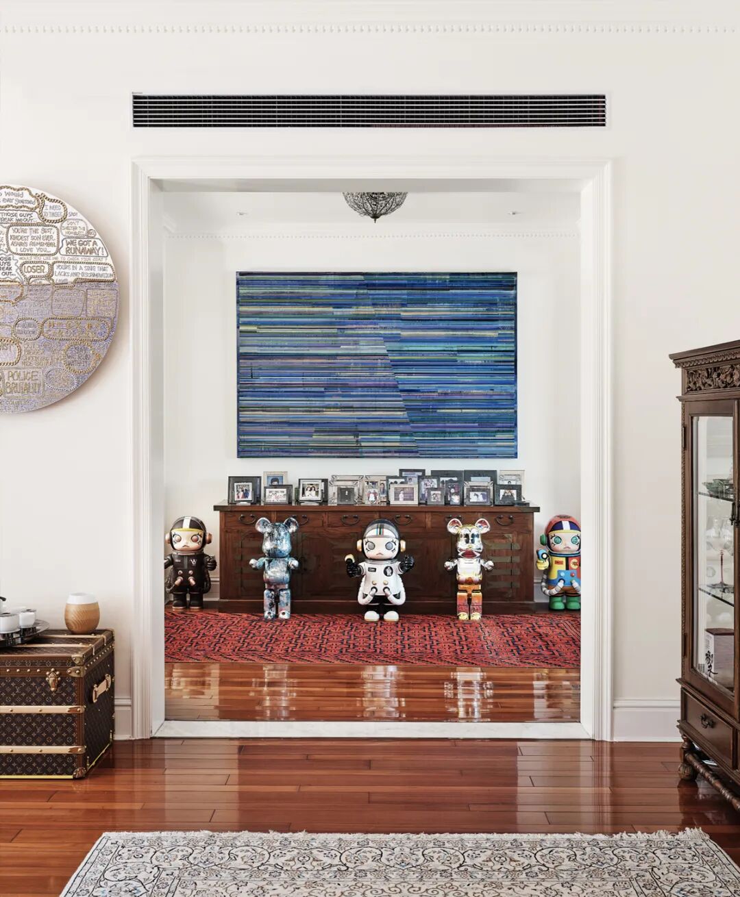主客厅里,一件4米长的巨幅画作静静矗立,看似凌乱的几何线条铺满画面,犹如迷宫又自有秩序。这是艺术家陆新建“城市基因”系列中的一件作品,他擅长以看似抽象的线条来表现错综复杂的现代都市。对面钢琴上,放置着著名雕塑家蔡志松的一组小雕塑作品——鹿,光滑流丽的外形闪动着灵韵。旁边的墙上则悬挂着徐震的镜面不锈钢装置作品——《金属的语言》,幽默、困惑、矛盾、喜悦......当你面对镜面,可以照出自己的形象,更能读出自己潜意识中的情感。