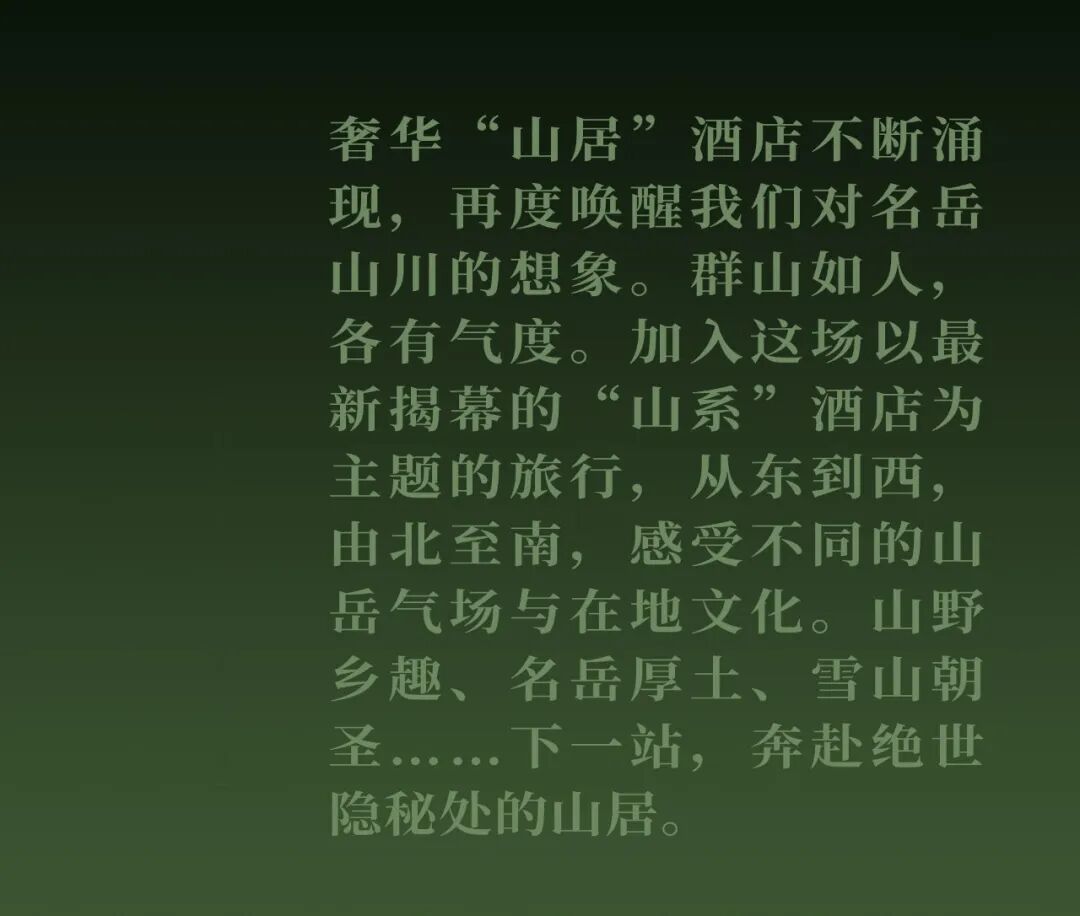所谓“山居”,不仅开设在关注度越来越高的传统三山五岳,更剑指那些被群山环绕,人迹罕至,鲜被外界所知的风景绝佳之地。如果细细品味,你会发现,群山如人,各有气度。一场以最新揭幕的“山系”酒店为主题的旅行,从东到西,由北至南,裹挟着不同的山岳气场与在地文化,正缓缓向我们走来……