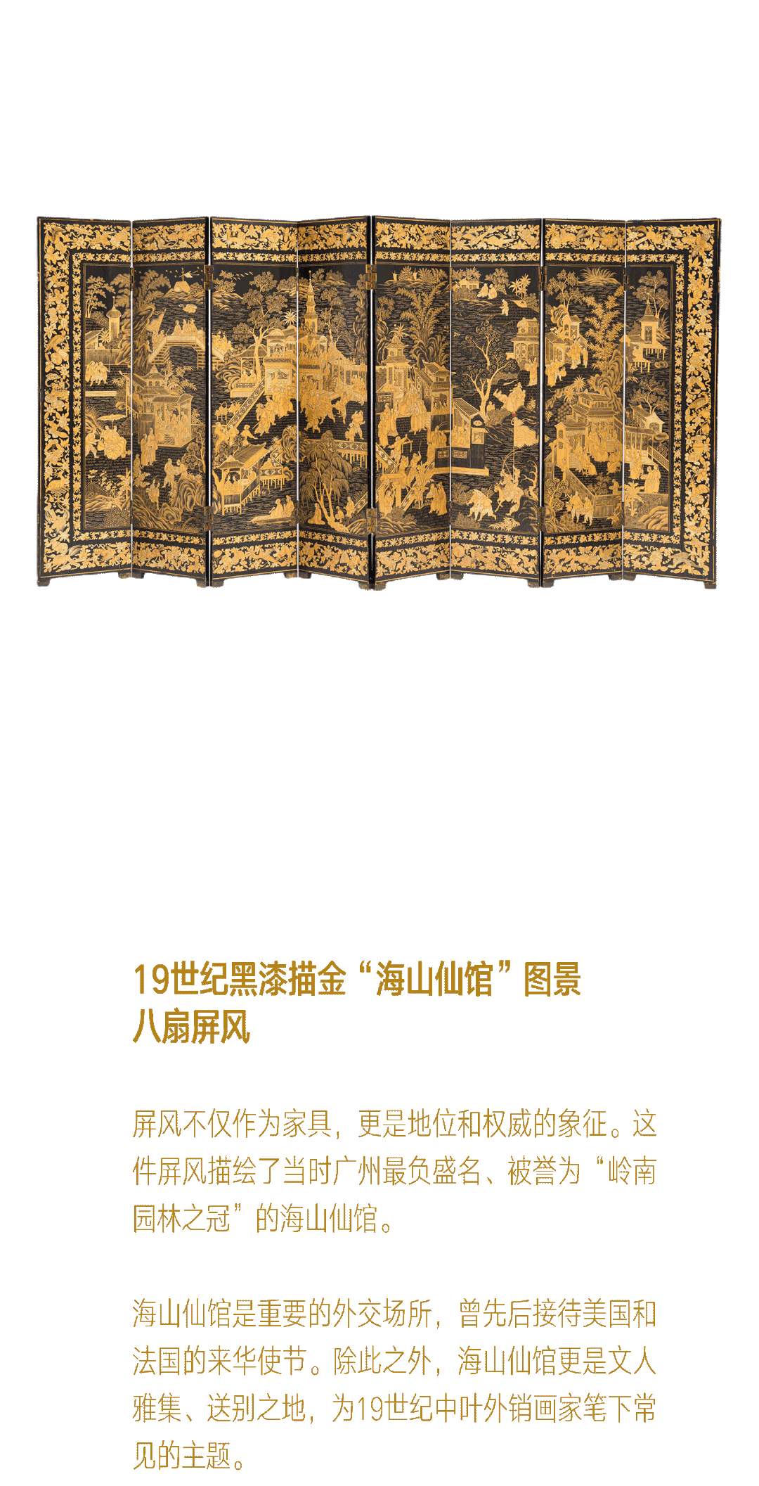 晚清黑漆描金“游船图”女红桌,19世纪黑漆描金“海山仙馆”图景八扇屏风,晚清黑漆描金“庭院仕女婴戏图”茶叶罐,19世纪黑漆描金菱花满大人茶叶箱