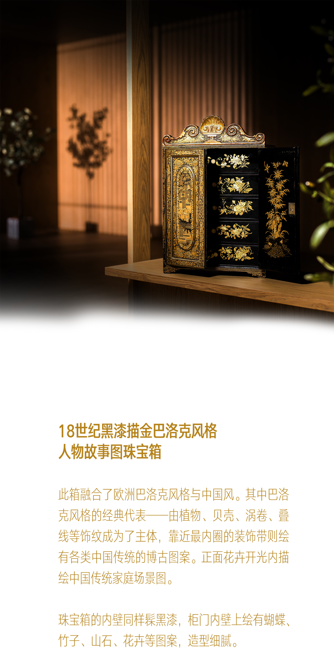 展出的这些作品最早收藏于欧洲贵族家庭,而KCG搜罗这些作品的过程历时超过1年。在选择藏品时,我们除了要求艺术品能展现精湛的黑漆描金工艺技术,更注重作品背后的故事和历史背景,所有收藏的艺术品均展现了18、19世纪中西文化交流的历史背景,既能展现中国工艺技法之美,又能凸显因东西文化碰撞而产生的时代风貌。