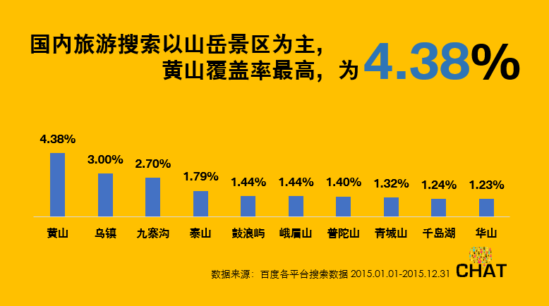CHAT北京2016论坛上,百度高级营销顾问陈旭先生,以新时代国民旅游偏好为主题,深入讲解了大数据在当下旅游业的应用。其中特别提到关于国内搜索的主要的目的地,也就是在国内大家都喜欢去哪玩。