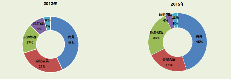 厦门依然是奖励旅游的重要目的地之一,上海、北京和广东是主要客源市场。由于旅游客源的大幅增加,2015年的会议会展客源需求占比较2012年降低4%。另外,“国八条”后,政府类型的会议大幅减少。2015年,由于之前葛兰素史克事件和一系列相关药企丑闻事件导致的医药会议短暂消失之后,而在2015年又重新呈现回暖的趋势。