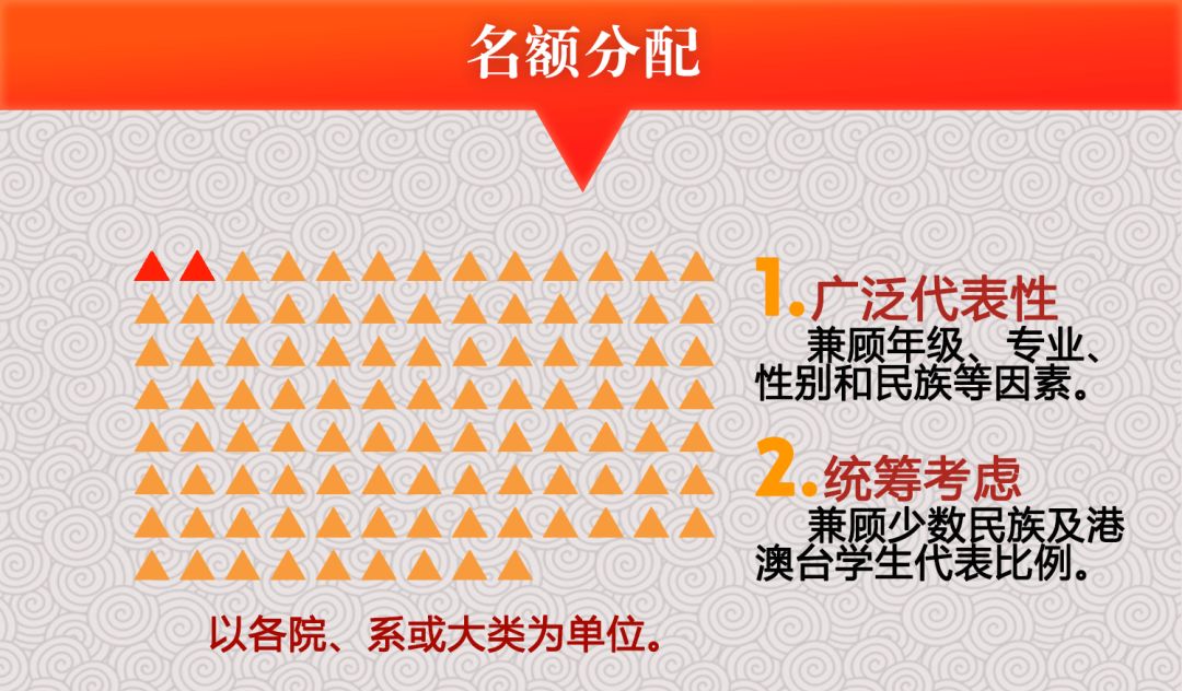 代表的选举是以各院(系、大类)(以下统称“选举单位”)进行,原则上按照选举单位的全日制在读本科生总人数2%的比例来分配代表名额。想要迅速了解每个选举单位的代表名额,请跳至文末附表参看。