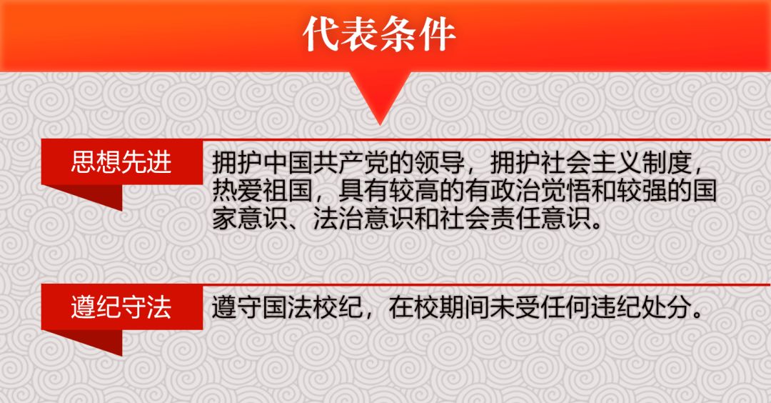 学代会的代表需要具备一些基本条件:必须是我校全日制中国籍在校本科生(包括港澳台学生)可作为所在选举单位正式代表参加学生代表大会;来华留学生如有意愿参加学生代表大会,能够以特邀代表形式列席,其中,正式代表有决议权和选举权,列席代表有提议权,并无决议权和选举权。代表毕业后,名额仍归所在单位所有,由所在单位递补代表。代表需要具备良好品质,主要包括:“思想先进”“遵纪守法”“品学兼优”“积极热心”“议事能力强”。