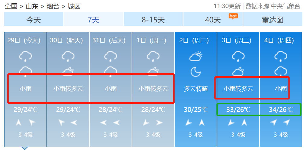 烟台各区市:29日夜间,多云间阴,局部有阵雨;东南风,沿海及内陆3-4级;最低气温,沿海25℃,内陆24℃。