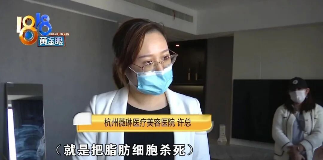 杭州薇琳医疗美容医院 许总:“仪器有仪器自定的一个温度的。(记者:如果冷冻的温度过低,会不会造成人体的副作用)这个已经经过FDA和CFDA认证的。(就是把脂肪细胞杀死?)对(不会把其它健康的细胞杀死?)对(多少时间吸进去?)一个卡点我们是一个小时60分钟。”