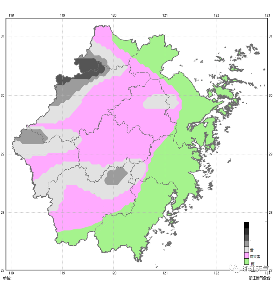 今天夜里到明天,浙江将有大范围雨雪天气,山区有积雪和冰冻;较明显降温和大风天气。除舟山地区、甬台温东部地区外,浙江大部地区有雨夹雪或雪,高海拔山区部分中到大雪。