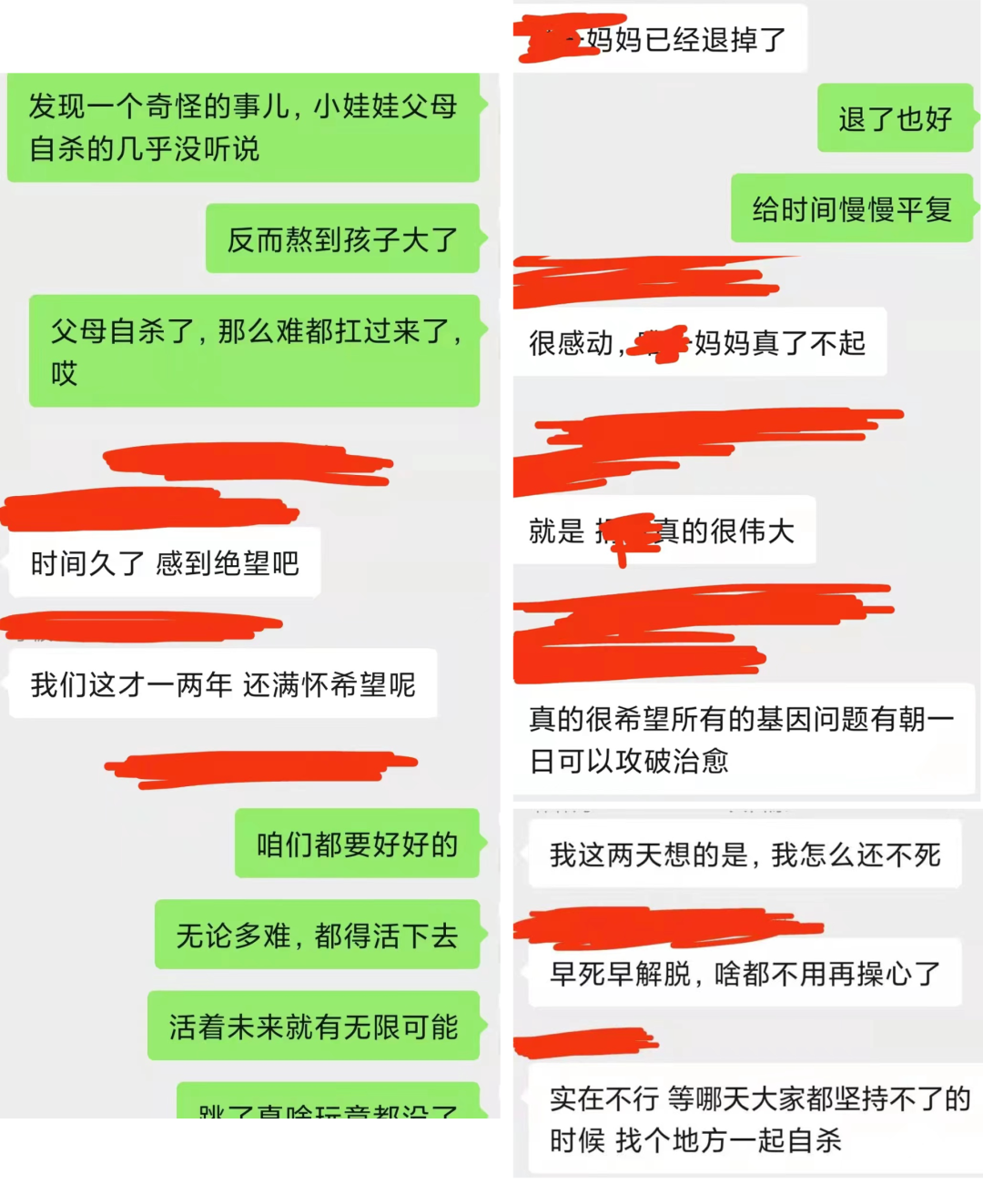 “发现一个奇怪的事:小娃娃父母自杀的几乎没听说,反而熬到孩子大了,父母自杀了……那么难都扛过来了。唉。”这天下午,她打开手机,群里跳出一条评论,是一个孩子的母亲发的。
