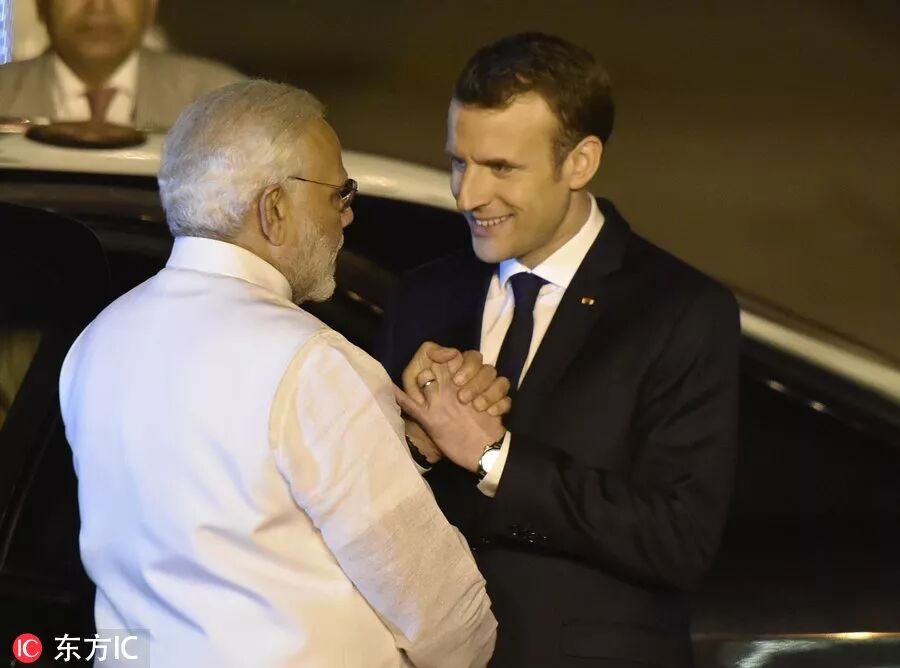 ▲当地时间3月9日,法国总统马克龙出访印度抵达新德里,印总理莫迪机场亲自迎接,送“熊抱”欢迎。(东方IC)