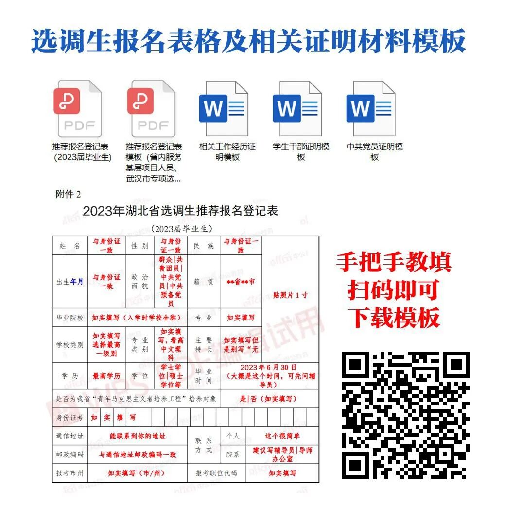 (1)报考申请。符合选调范围和条件的报考人员,登录湖北省人事考试网下载并填写《2023年湖北省选调生招录推荐报名登记表》,及时向所在院系党组织、所在单位党组织和乡镇(街道)党(工)委提交报考申请,同时提交中共党员、学生干部、获奖证书、学历学位证书、工作经历等相关证明材料。
