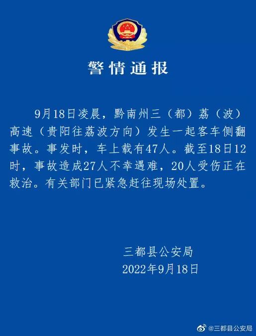 贵州省黔南布依族苗族自治州三都水族自治县公安部门通报,9月18日凌晨,黔南州三(都)荔(波)高速(贵阳往荔波方向)发生一起客车侧翻事故。事发时,车上载有47人。截至18日12时,事故造成27人不幸遇难,20人受伤正在救治。有关部门已紧急赶往现场处置。