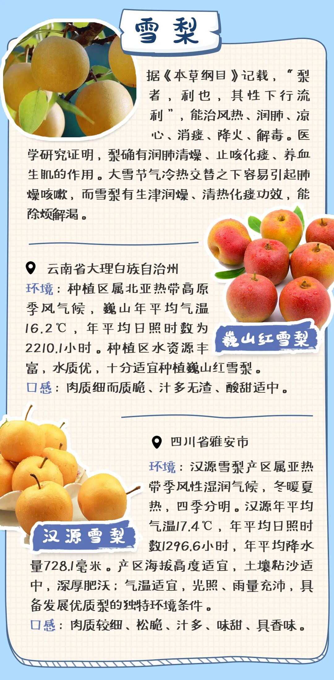 据《本草纲目》记载,“梨者,利也,其性下行流利。”大雪节气冷热交替之下容易引起肺燥咳嗽,雪梨有生津润燥、清热化痰功效。此外,梨子有“天然矿泉水”的美称,干燥的冬季里食用水分多多的梨子是再合适不过啦!