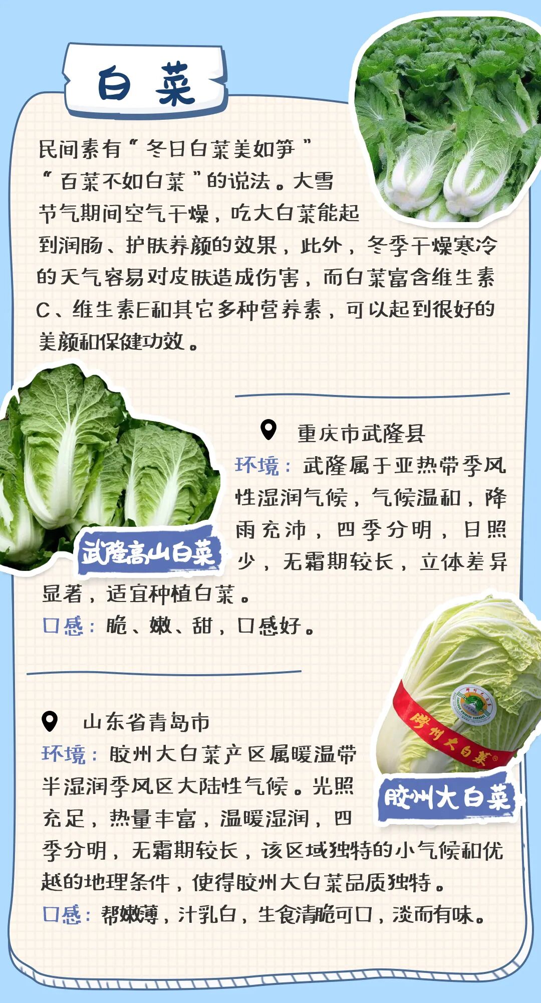 民间有“冬日白菜美如笋”“百菜不如白菜”的说法。大雪节气期间气候干燥,吃大白菜能起到润肠的作用,此外,寒冷干燥的天气容易对皮肤造成伤害,白菜富含维生素C、维生素E及多种营养素,可以起到很好的美颜保健功效。