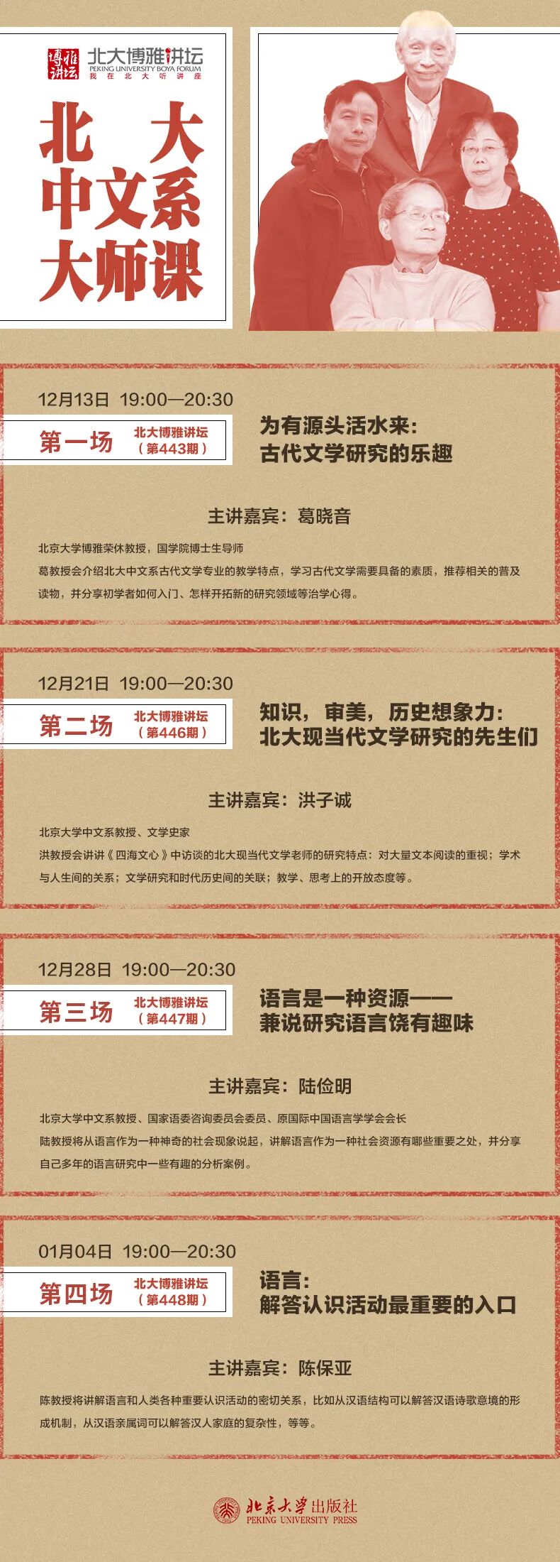 在未来的一个月,大家将有机会听到四位中文系大师的讲座,他们将介绍各自的治学经历和灵感,关于各个方向如何进行学习和研究,他们也会介绍自己数十年来的经验和方法。