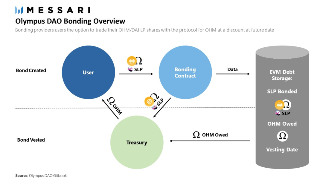 影响OHM的债券有两种类型:Sushiswap LP(SLP)债券和DAI债券。债券归属期超过5天。当债券的折现率超过5天的质押回报率时,用户就会受到激励而购买债券。从债券中获得的资产被存入国库,OHM以国库资产的无风险价值(RFV)为基础铸造,并分发给利益相关者。
