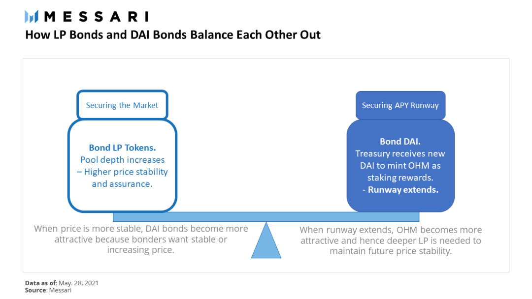 如果LP债券保证了市场的流动性,更好地确保了价格稳定,而DAI债券确保了未来收益率的空间,吸引了新进者并激励OHM持有人将他们的OHM进行质押,这会形成钟摆或平衡时间表,在两种不同债券的需求和供应之间交替。