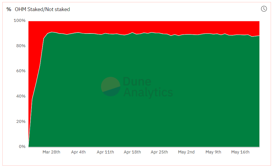 由于每天有三次0.6%的Rebase,OHM的质押者一直保持稳定。OHM的质押比例一直保持在87%以上,这表明(3,3)运动确实是人们质押OHM的强力诱因。