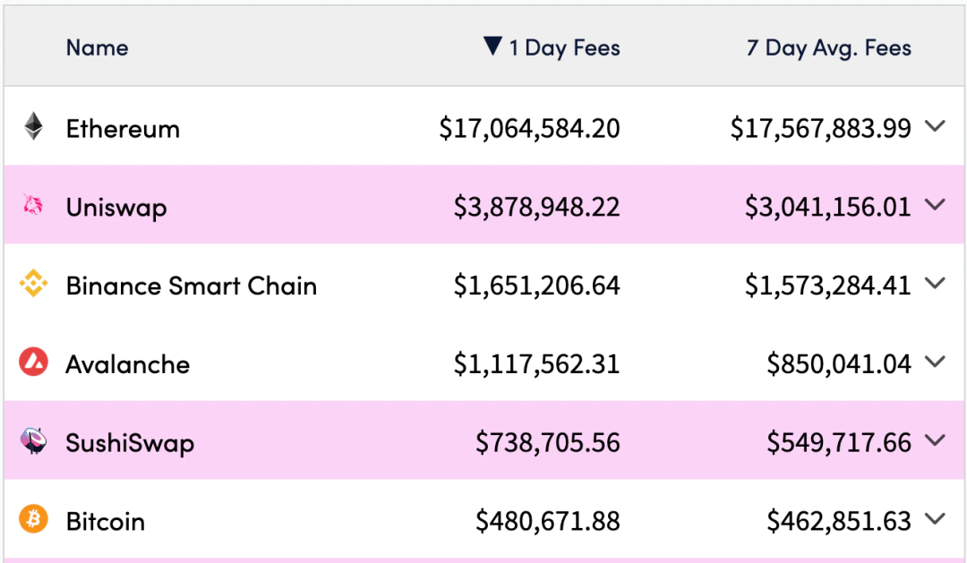我们现在可以看到这种情况正在发生,因为多个智能合约平台的费用收入已经超过了比特币,包括几个以太坊应用程序。与转移比特币相比,市场愿意为在以太坊上交换代币支付更多费用。