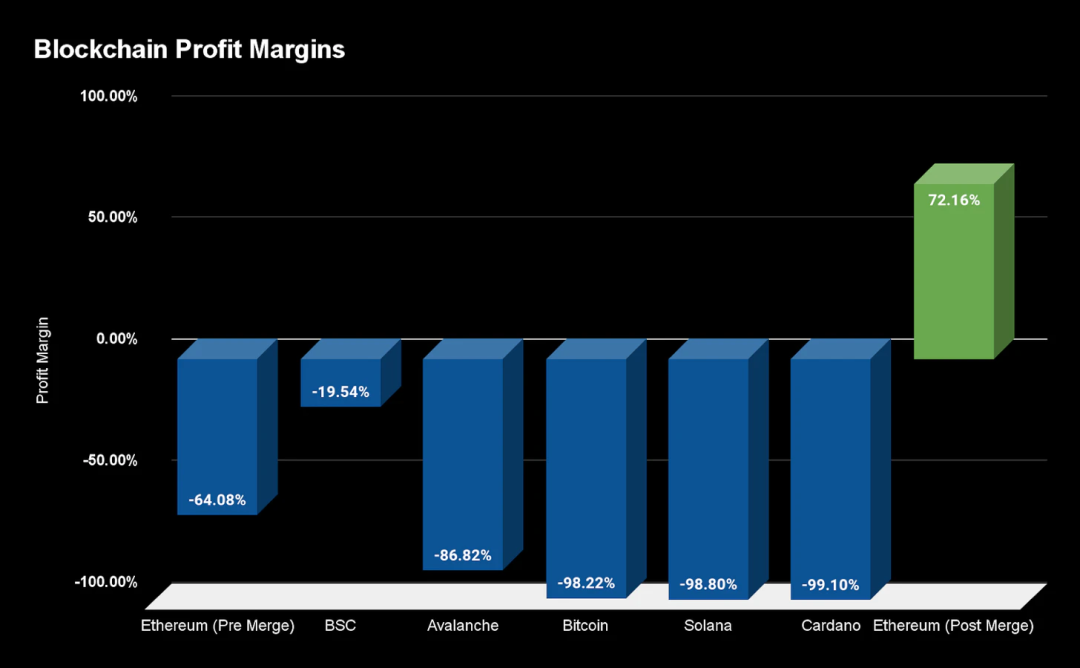 当我们看比特币时,这一点更加明显。比特币实际上只有一个应用——移动比特币。因此,它难以产生大量的区块空间收入,如其 -98% 的利润率所示。