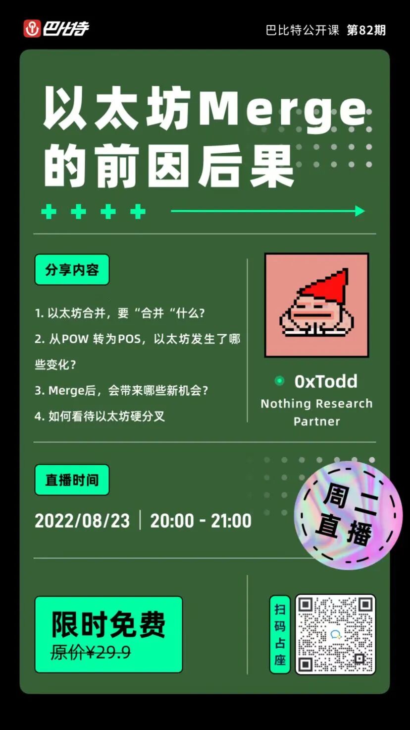 合并后对ETH有什么影响?作为持有者,需要做些什么?明晚8点,听0xTodd讲讲以太坊合并的前世今生,详情戳海报