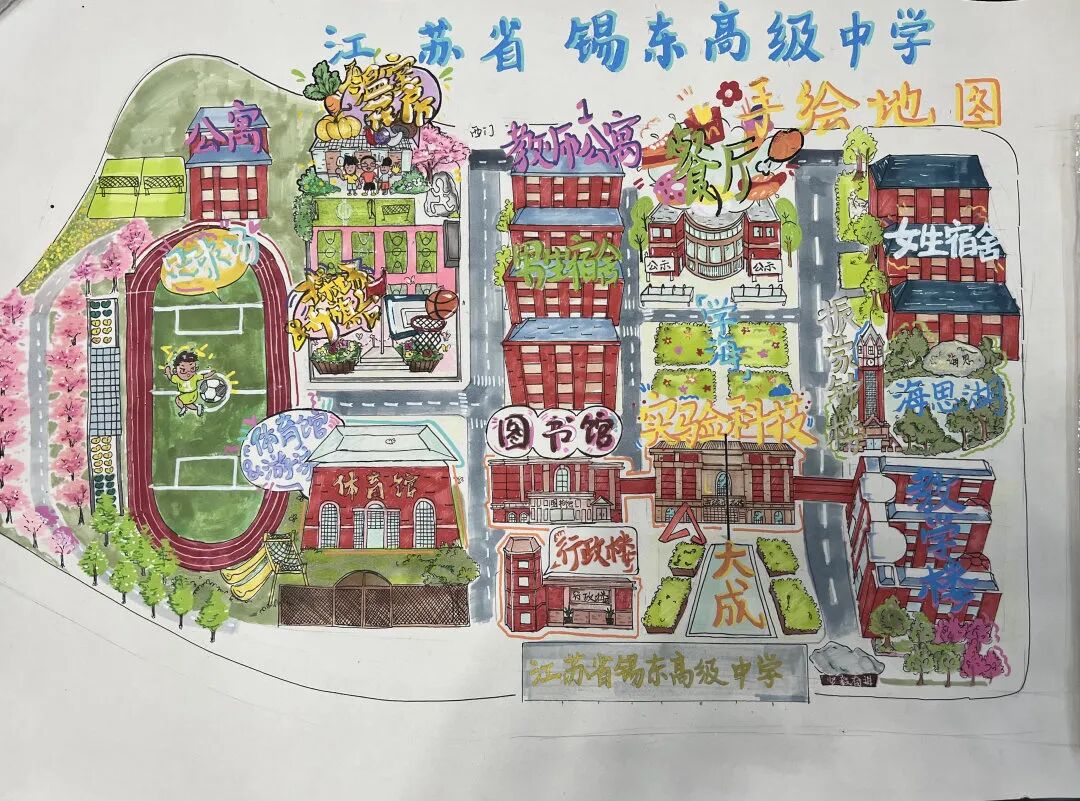 这是陆希雅手绘的锡东高级中学地图,今年6月是她的高中毕业季,她用这幅地图表达对母校的深深爱恋。