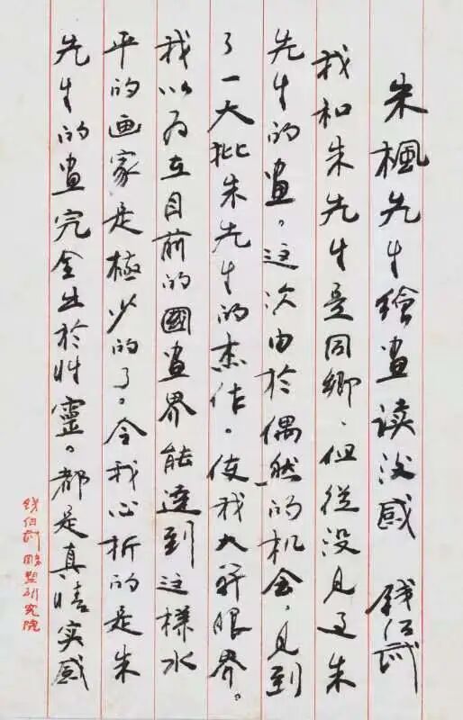 钱绍武与朱枫本不认识,也是在看到朱老画作后,非常惊讶与钦佩,不但写信给他,还于2006年6月16日专程来锡与朱老见面,“钱老称赞恩师——‘朱枫先生的画作精品和世界级的艺术大师比毫不逊色’,这是属于他们两位之间惺惺相惜才有的高度评价。”
